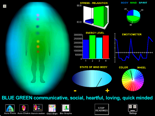 For a long time I have wanted a device, or software, to record changes in our energy field, in particular our Aura. Due to the strength of the Australian dollar I have now purchased software and equipment from the US at a reasonable price which allows me to do this. I intend to use it in several ways. When I take in clients for the first time it will be part of your initial consult. You will receive a 20 page report as well as some photo images of your aura. Then over time we will review your changes. If you want to have a new photo printed out in each session you can, if not I will just leave it on file. There will of course be a cost for this service and if you don’t want the printout you don’t have to, but I will keep the images on file for my records. I would however encourage you to do so for your own information as well. Of course clients who are not “new” and would like to have their aura reproduced can of course do so. This will be a wonderful way to assess changes in your energy system aside from the changes you notice in yourself and your life.
